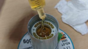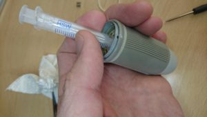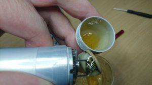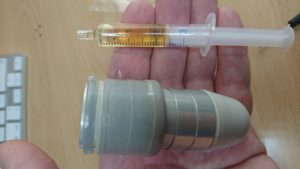 Nun kann das Öl? (falls jemand weiß, welches Material das wirklich ist – ich würde mich freuen, es zu erfahren) – entfernt werden. Ich habe es vorsichtig mit 2ml Spritzen herausgezogen um es aufzuheben und wieder einfüllen zu können.