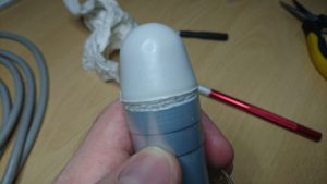 Zuerst habe ich mich ein wenig über die Ultraschallsonde schlau gemacht. Hierbei handelt es sich um eine mechanische Sektor Ssonde, die bei 3.5 und 5.0MHz arbeitet. Der Kristall ist hier auf einem, in einer Achse beweglichen Kopf (man kann sich eine Wippe vorstellen) montiert, die über einen kleinen Aktuator mittels Bowdenzugs angetrieben wird. Die folgenden Bilder zeigen die Ultraschallsonde in den unterschiedlichen Demontagezuständen.