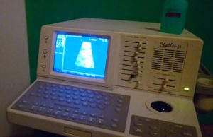 Sehr günstig und als defektes Bastlergerät habe ich diesmal dieses schmucke Teil erworben. Es handelt sich um einen Easote Sim7000 Challenge Ultraschallscanner, der in der Medizintechnik eingesetzt wurde. Das Gerät stammt aus dem Jahr 1998, hat in etwa die Größe eines alten PC-Gehäuses mit einer integrierten Tastatur und einem Trackball und wiegt knappe zehn Kilogramm. Ein eingebauter 10 Zoll Monochrommonitor ermöglicht das Arbeiten ohne weitere externe Geräte. Mitgeliefert wurde auch eine, als defekt markierte Ultraschallsonde der Type 5075 AA-C. Also ran an den „Speck“ und sehen, ob man das nicht reparieren kann. Ein kurzer Funktionstest zeigt, dass die Sonde zwar prinzipiell arbeitet, aber ein absolut verwischtes Bild produziert. Diejenigen, die das Prinzip des Filmprojektors noch kennen, können sich das in etwa wie einen Film vorstellen, der ohne Verschluss an der Projektionslinse vorbeigezogen wird…