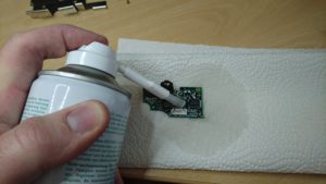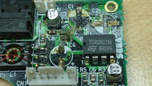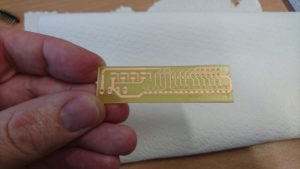 Die Elektronik besteht aus einem H-Brückenmodul, einem Arduino Nano sowie einem China DC/DC – Converter. Das Zusammenschrauben der Module funktioniert prinzipiell ganz gut, aber als Elektroniker macht man natürlich eine eigene Platine, auf der alles Nötige drauf ist. Also habe schnell ein geeignetes Layout erstellt und per nasschemischer Fertigung hergestellt. Es mag zwar immer Leute geben, die Platinen gerne in einen Fräsbohrplotter einspannen und die Maschine per spanendem Verfahren Material abtragen lassen, aber wenn es schnell gehen und auch schön werden soll, dann wird natürlich geätzt. So sind auch dünnste Leiterbahnen problemlos möglich. Und der ganze Prozess (egal wie groß die Platine ist) dauert gerade einmal 30 Minuten.