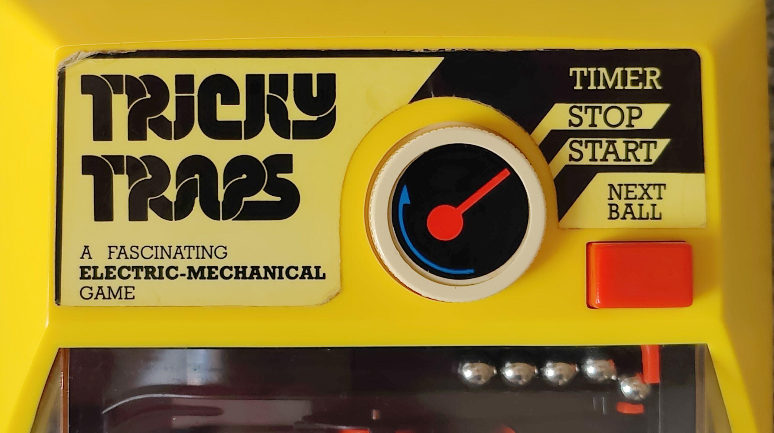 Das Spiel „Tricky Traps“ von Tomy ist ein mechanisches Geschicklichkeitsspiel, das ursprünglich in den 1970er Jahren veröffentlicht wurde. Es besteht aus einem labyrinthartigen Spielfeld, bei dem der Spieler eine kleine Metallkugel durch eine Reihe von Hindernissen und Fallen navigieren muss. Ziel des Spiels ist es, die Kugel erfolgreich durch das Labyrinth ins Ziel zu manövrieren, ohne dass sie in eine der vielen Fallen fällt. Es stehen fünf Kugeln zur Verfügung. Das Spiel läuft auf Zeit.