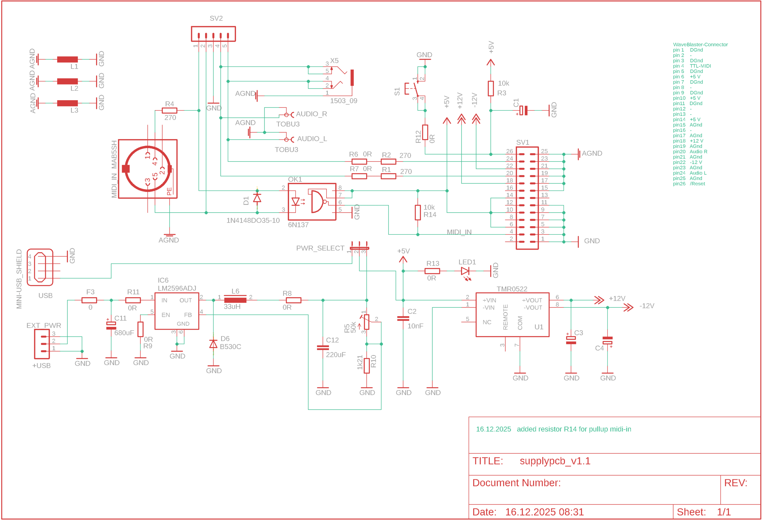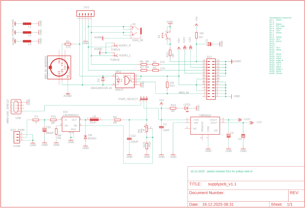 Daraus entstand schlussendlich der folgende Schaltplan. Die 5VDC Versorgung der USB Quelle wird direkt zur 5V Versorgung des Midi Boards geführt. Die ebenfalls benötigten +12V/-12V erzeugt ein DC/DC Converter (TMR0522). Dieser wird eingangsseitig vom 5V Netz versorgt. Der optionale „Externe“ Spannungseingang gelangt an einen LM2596ADJ. Das ist ein Step-Down Voltage-Regulator der mit Eingangsspannungen bis zu 40V arbeiten kann. Die geregelte Ausgangsseite ist in vielen Bereichen verfügbar. Ich habe hier den ADJ (Adjustable) Typ in die Schaltung integriert, da ich davon einige Stück im Sortiment Kasten habe. Durch einen Jumper am Board ist, die Spannungsquelle wählbar.