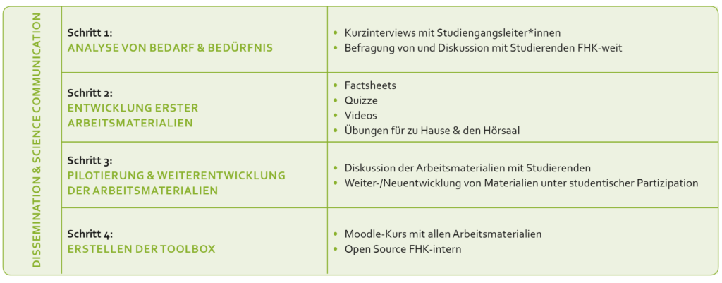 Zu den einzelnen Schwerpunkten werden unterschiedliche Arbeitsmaterialien konzipiert, pilotiert und in einer Toolbox zusammengefasst. Diese wird Lehrenden und Studierenden der Fachhochschule Kärnten (FHK) als Open Source zur Verfügung stehen. Partizipation von Studierenden und Mitarbeitenden der FHK versteht sich dabei als handlungsleitendes Element.