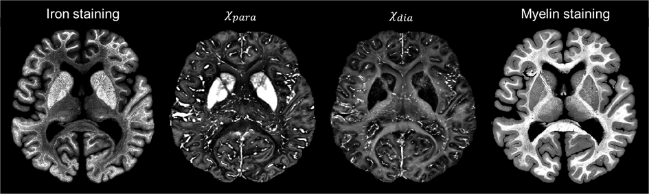 The results showed statistically significant linear correlations between paramagnetic susceptibility values and iron staining optical density, as well as between diamagnetic susceptibility values and myelin staining optical density. Qualitative comparison revealed clearly delineated substructures in several brain regions such as the laminar structures of the globus pallidus and the subthalamic nuclei, within both the paramagnetic and diamagnetic susceptibility maps regions. However, some areas of high myelin concentration within the globus pallidus in the basal ganglia were not well represented in the diamagnetic susceptibility map. This discrepancy may highlight the need for further improvements in the χ-separation.