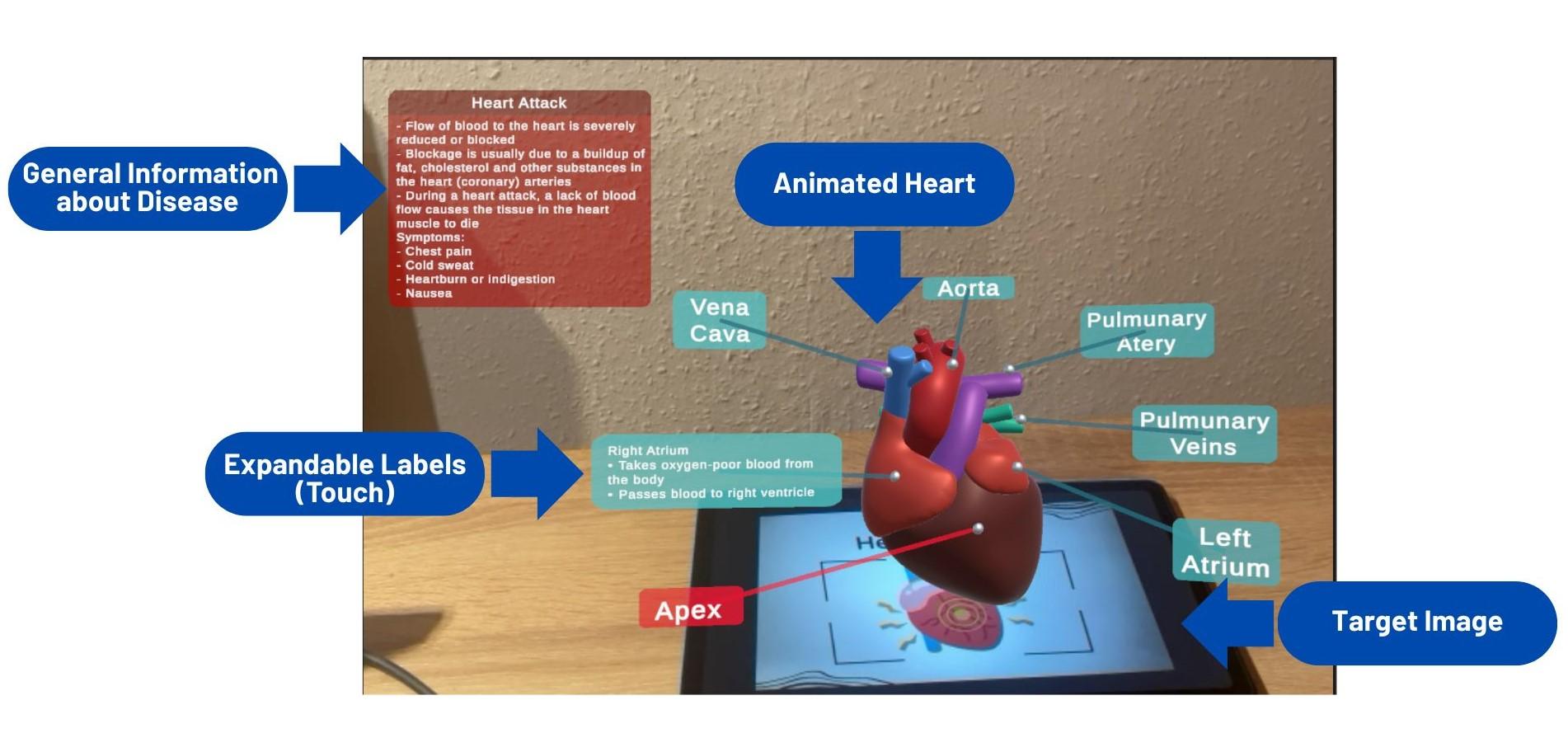 Users point the tablet’s camera at a printed image—kind of like scanning a QR code—that’s labeled with a specific heart condition, such as “heart attack” or “atrial fibrillation.” When recognized, the app overlays a 3D animated heart model in augmented reality (AR), showing how the heart behaves under that condition. Labels identify different parts of the heart, and a brief info panel explains the disease. Tapping on a label reveals more details about that heart part, which you can collapse again when you’re ready to move on.