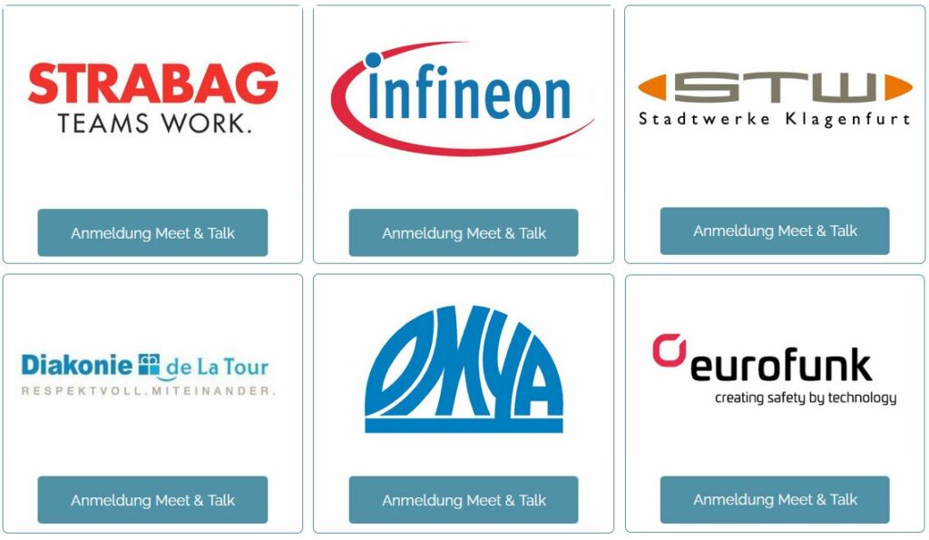 Im heurigen Jahr finden Ihre persönlichen Gespräche mit Unternehmen nicht am Campus Villach sondern online statt. Studierende und Alumni können sich ab dem 1. April 2021 über die Meet & Match Website unter „Aussteller“ Ihre Gesprächstermine bzw. Meet & Talks buchen (siehe unten). Die Meet & Talks finden am 6. Mai 2021 statt.