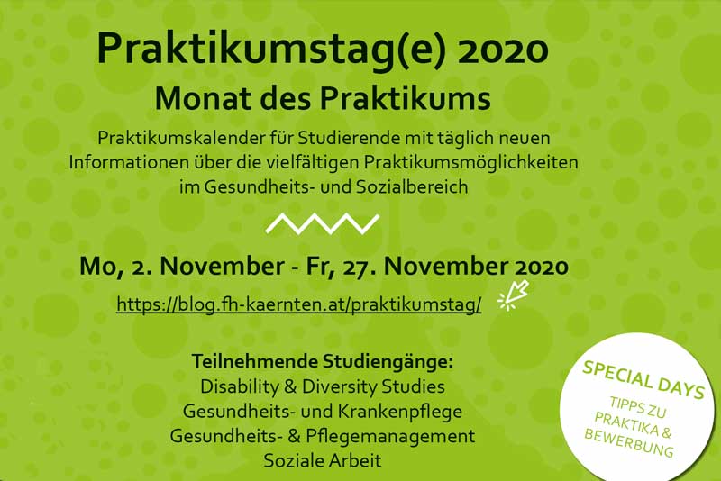 Motiviert wie jedes Jahr sind wir in die Vorbereitungen für den Praktikumstag 2020 gestartet. Doch dann kam Covid und alles war anders. Auch vor unserem Praktikumstag hat der Virus nicht Halt gemacht. Daher findet der diesjährige „Praktikumstag“ der Studiengänge Disability & Diversity Studies, Gesundheits- & Krankenpflege, Gesundheits- & Pflegemanagement und Soziale Arbeit im neuen online Format als „Praktikmstag(e) – Monat des Praktikums“ vom 02. bis 27. November 2020 statt. Dies ist heuer auch gleichzeitig unser Thema.