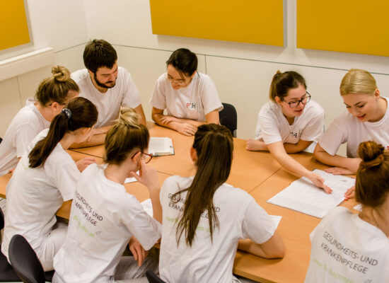 Melanie Breznik, Kathrin Radl, Valentina Pezer und Isabella Wilhelmer erheben die Leistungsemotionen im Rahmen des Simulationstrainings von Studierenden der Gesundheits- und Krankenpflege